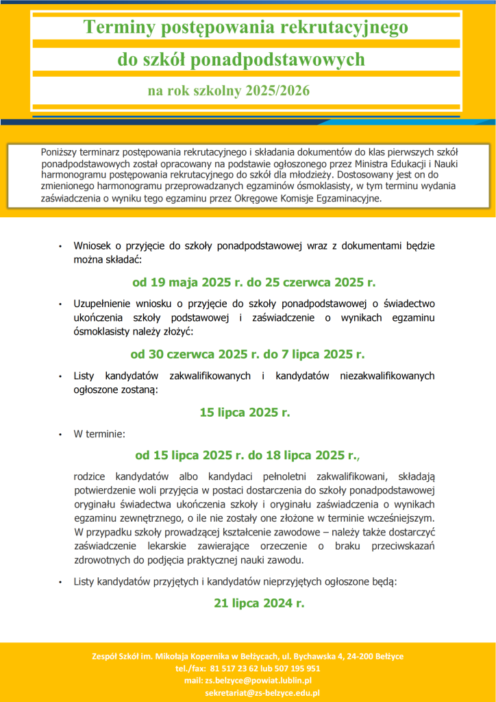 Terminy postępowania rekrutacyjnego i postępowania uzupełniającego na rok szkolny 2025/2026